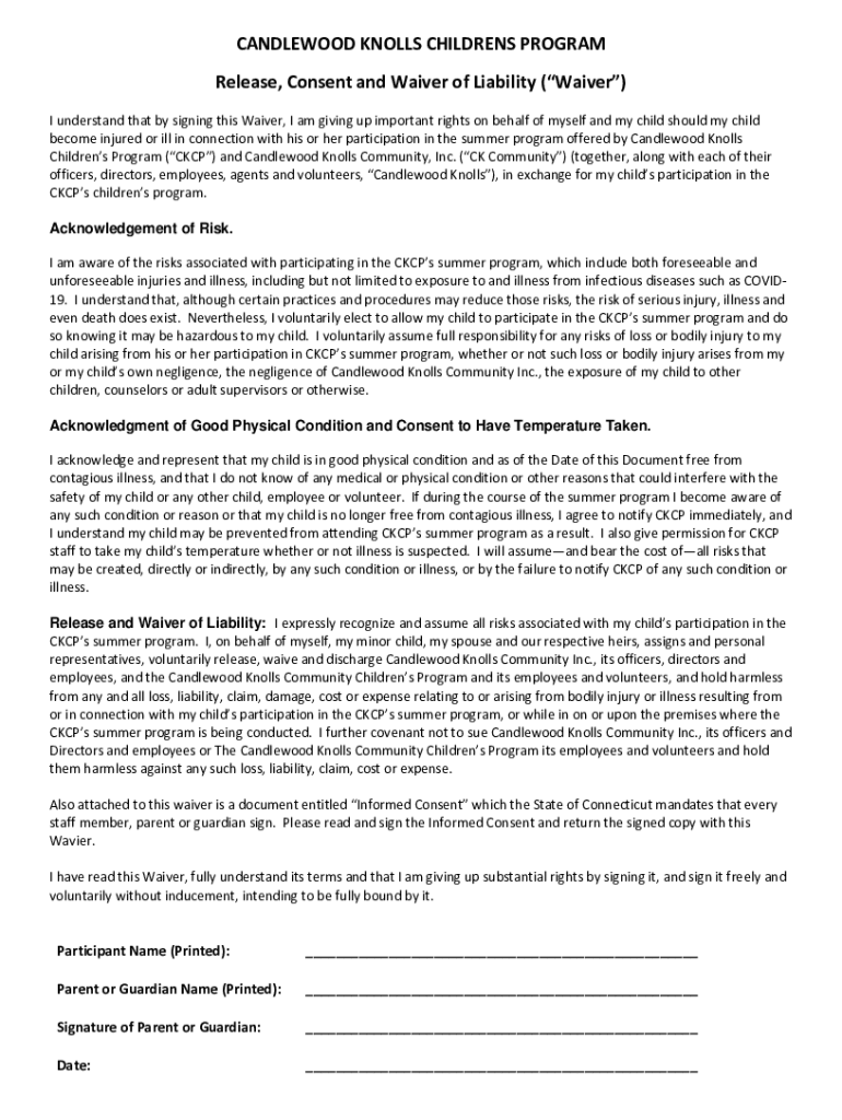 INGLEWOOD KNOLLS CHILDREN PROGRAM Release, Consent and Waiver of Liability (Waiver) I understand that by signing this Waiver, I am giving up important rights on behalf of myself and my child should