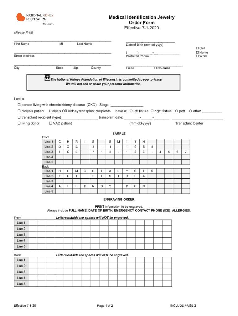 Medical Identification Jewelry Order Form Effective 712020 (Please Print)___ First NameMI_________Last Name Date of Birth (mmddyyyy)___ Street Address___ CityStateZip Cell Homework(___)______ Preferred