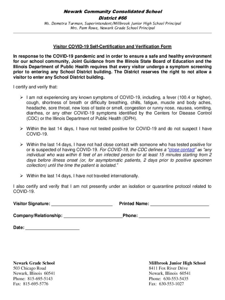 Newark Community Consolidated School District #66 Ms. Dementia Truman, Superintendent/Mill brook Junior High School Principal Mrs. Pam Rowe, Newark Grade School PrincipalVisitor COVID-19 Recertification