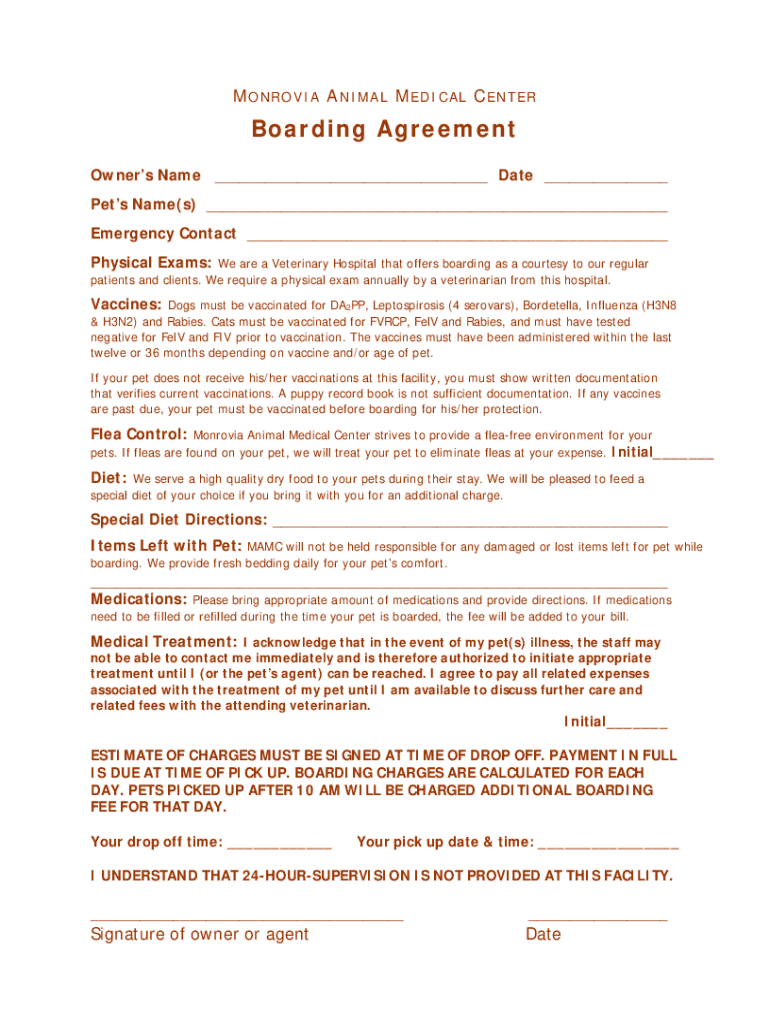 MONROVIA ANIMAL MEDICAL Waterboarding Agreement Owners Name ___ Date ___ Pets Name(s) ___ Emergency Contact ___ Physical Exams: We are a Veterinary Hospital that offers boarding as a courtesy to our
