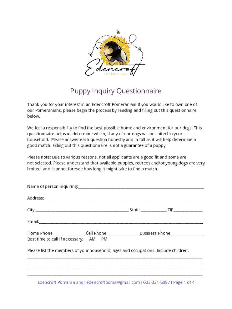 Puppy Inquiry Questionnaire Thank you for your interest in an Eden croft Pomeranian! If you would like to own one of our Pomeranians, please begin the process by reading and filling out this questionnaire