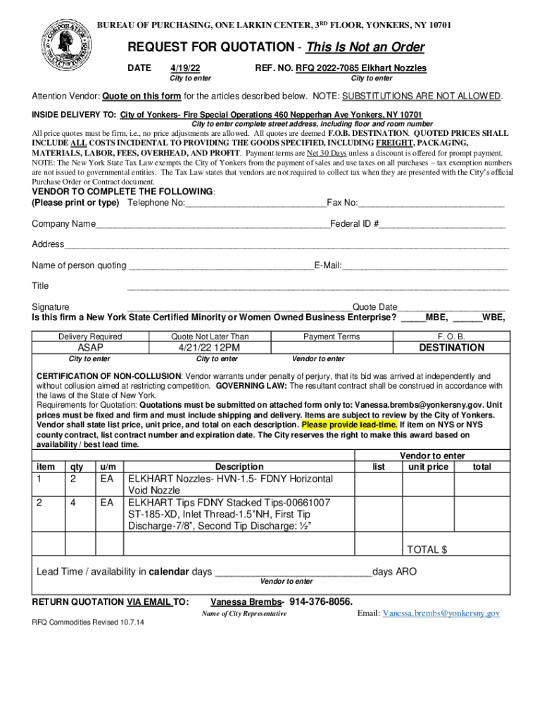 BUREAU OF PURCHASING, ONE LARKING CENTER, 3RD FLOOR, YONKERS, NY 10701REQUEST FOR QUOTATION This Is Not an Order DATE4/19/22REF. NO. RFQ 20227085 Elkhart NozzlesCity too intercity to enterAttention