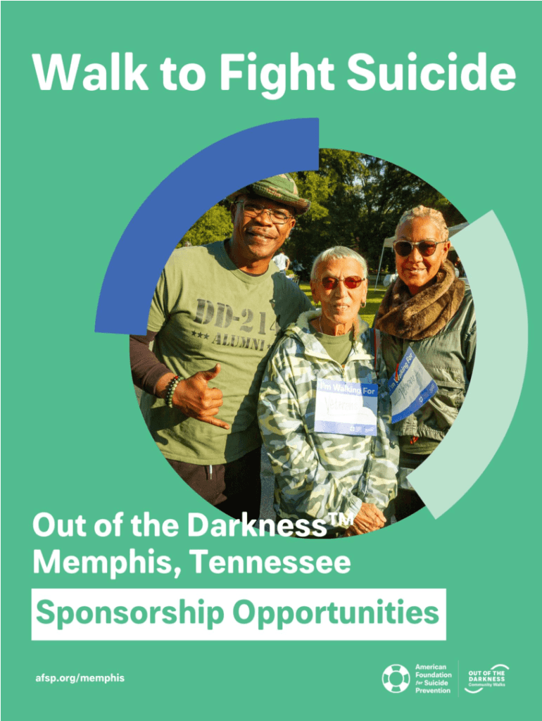 SPONSOR THE MEMPHIS WALK You can be an everyday hero in the fight against suicide. Join us today. Memphis Community Walk Memphis Botanic Gardens 750 Cherry Road, Memphis October 22, 2022 www.afsp.org/MemphisIn
