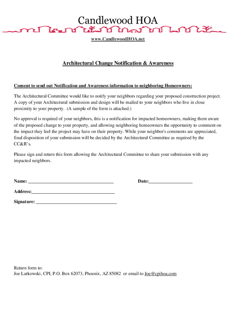 www.CandlewoodHOA.netArchitectural Change Notification & AwarenessConsent to send out Notification and Awareness information to neighboring Homeowners: