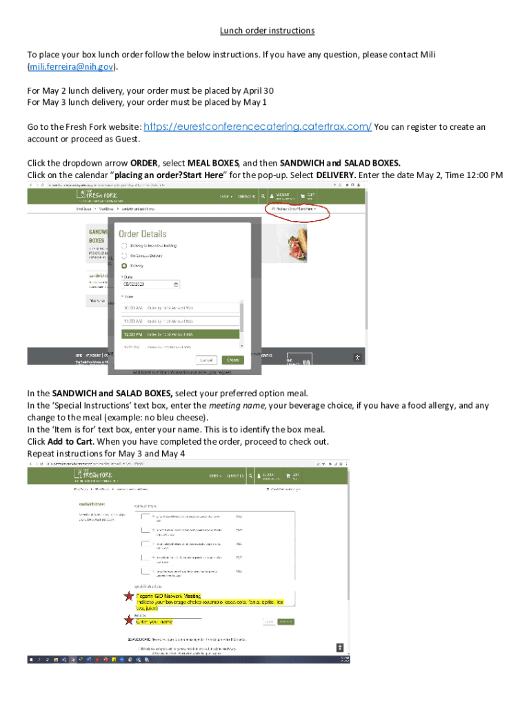 Lunch order instructions To place your box lunch order follow the below instructions. If you have any question, please contact Mile (mili.ferreira@nih.gov). For May 2 lunch delivery, your order must