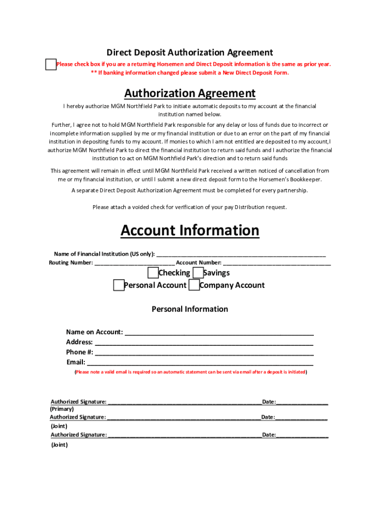Direct Deposit Authorization Agreement Please check box if you are a returning Horsemen and Direct Deposit information is the same as prior year. ** If banking information changed please submit a
