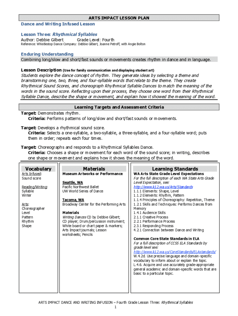 ARTS IMPACT LESSON PLAN Dance and Writing Infused Lesson Three: Rhythmical Syllables Author: Debbie Gilbert Grade Level: FourthReference: Whistle stop Dance Company: Debbie Gilbert, Joanne Petrify,