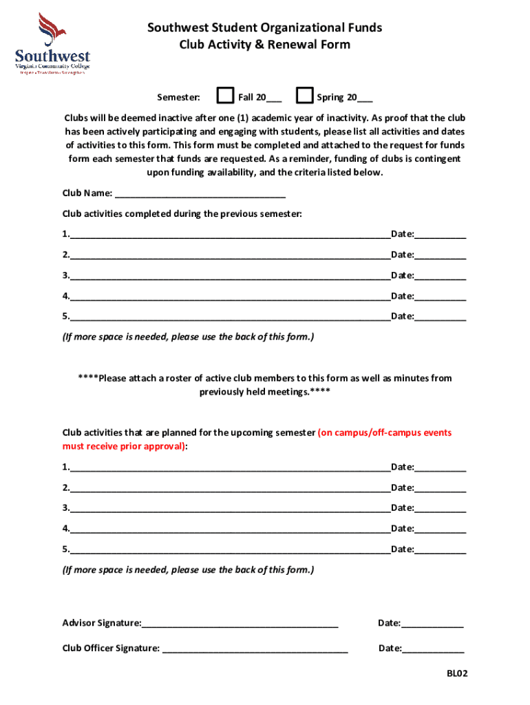 Southwest Student Organizational Funds Club Activity & Renewal FormSemester:Fall 20___Spring 20___Clubs will be deemed inactive after one (1) academic year of inactivity. As proof that the club has