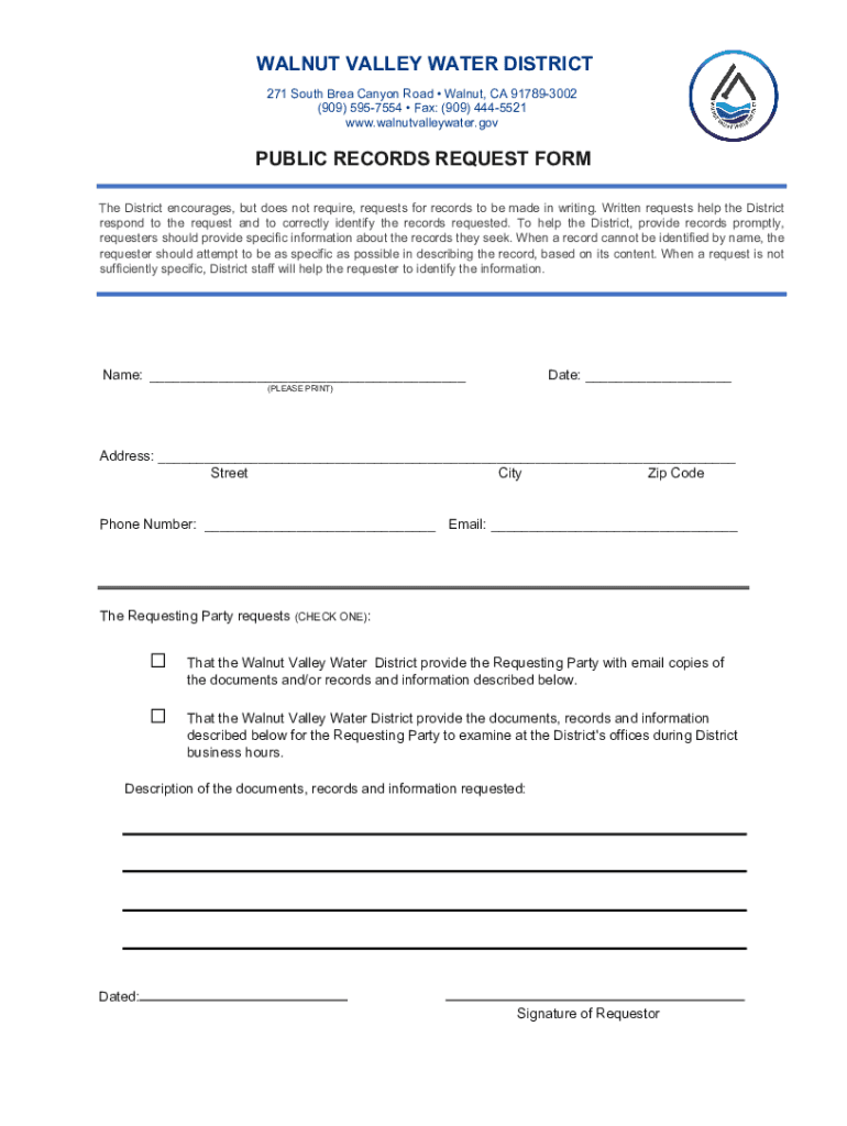 WALNUT VALLEY WATER DISTRICT 271 South Area Canyon Road Walnut, CA 917893002 (909) 5957554 Fax: (909) 4445521 www.walnutvalleywater.govPUBLIC RECORDS REQUEST FORM The District encourages, but does