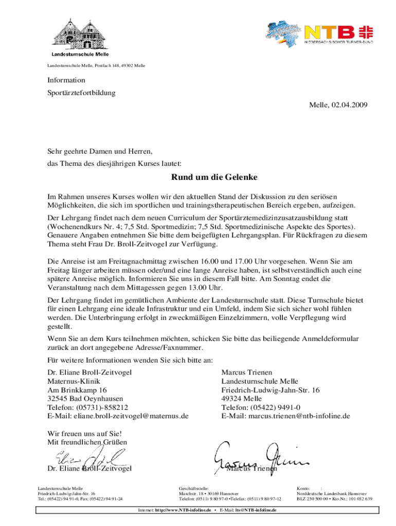 Landesturnschule Melee, Postal 148, 49302 MelleInformation