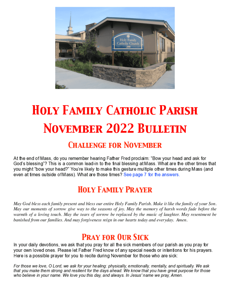 Holy Family Catholic Parish November 2022 Bulletin Challenge for November At the end of Mass, do you remember hearing Father Fred proclaim: Bow your head and ask for Gods blessing? This is a common