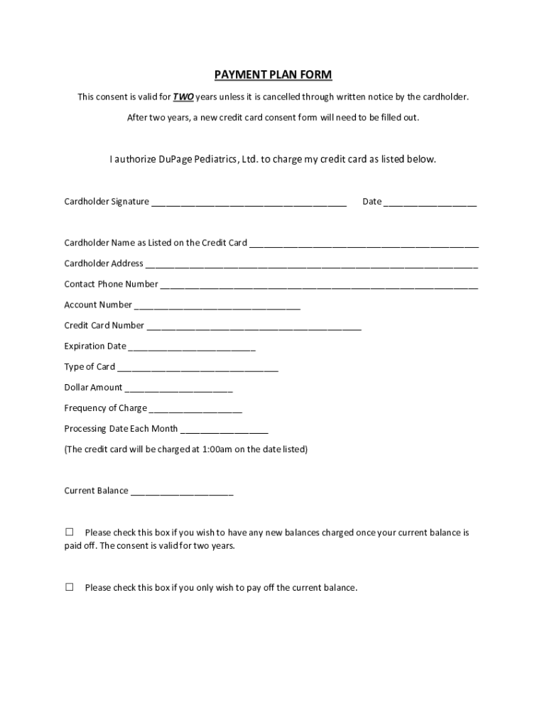 PAYMENT PLAN From This consent is valid for TWO years unless it is cancelled through written notice by the cardholder. After two years, a new credit card consent form will need to be filled out. I