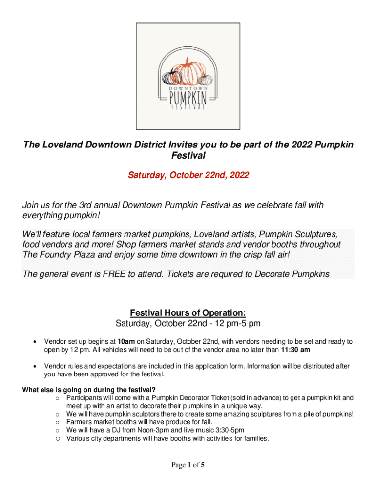 The Loveland Downtown District Invites you to be part of the 2022 Pumpkin Festival Saturday, October 22nd, 2022 Join us for the 3rd annual Downtown Pumpkin Festival as we celebrate fall with everything