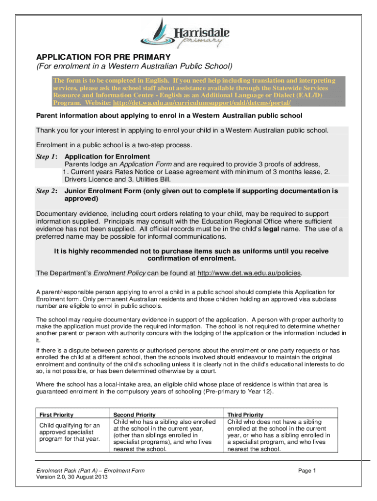 APPLICATION FOR PRE PRIMARY (For enrollment in a Western Australian Public School) The form is to be completed in English. If you need help including translation and interpreting services, please