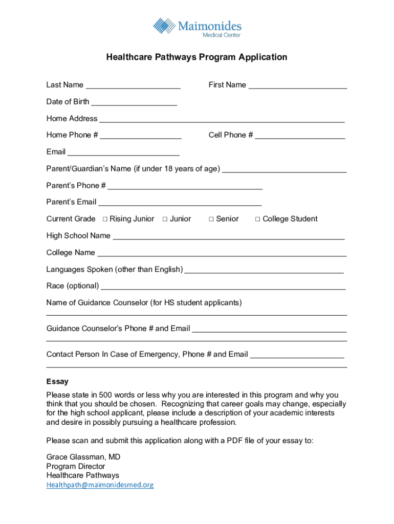 Healthcare Pathways Program Application Last Name ___First Name ___Date of Birth ___ Home Address ___ Home Phone # ___Cell Phone # ___Email ___ Parent/Guardians Name (if under 18 years of age) ___