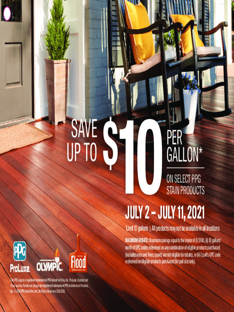 SAVE UP TO$10PER GALLON* ON SELECT RPG STAIN PRODUCTIVELY 2 JULY 11, 2021, Limit 10 gallons | All products may not be available in all locations×MAXIMUM REBATE: Maximum savings equal to the least
