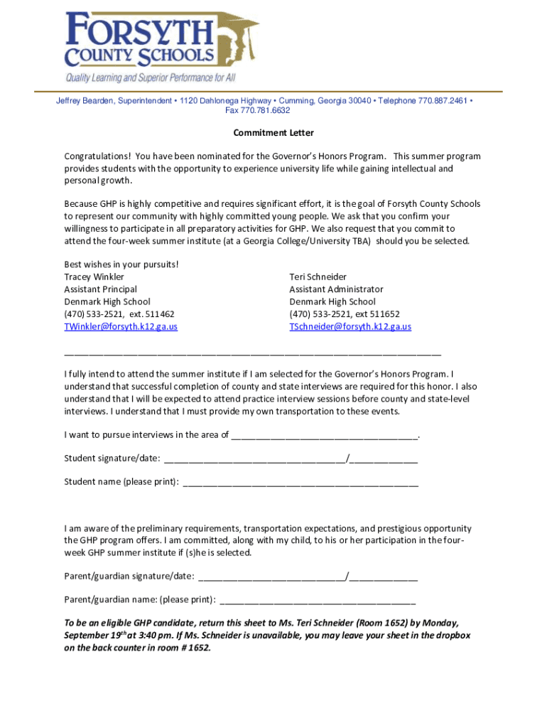 Jeffrey Bearded, Superintendent 1120 Daylong Highway Cumming, Georgia 30040 Telephone 770.887.2461 Fax 770.781.6632Commitment Letter Congratulations! You have been nominated for the Governors Honors