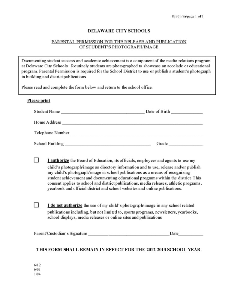 8330 F9a/page 1 of 1DELAWARE CITY SCHOOLS PARENTAL PERMISSION FOR THE RELEASE AND PUBLICATION OF STUDENTS PHOTOGRAPH/IMAGE Documenting student success and academic achievement is a component of the