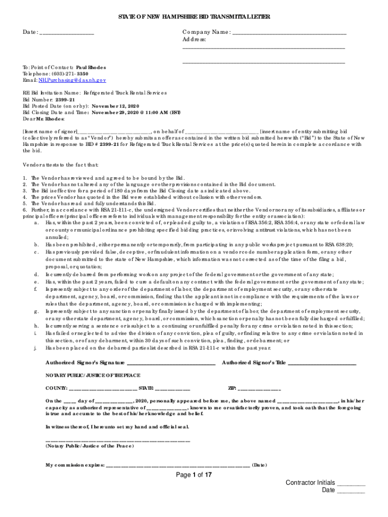 STATE OF NEW HAMPSHIRE BID TRANSMITTAL LETTER Date: ___Company Name: ___ Address: ___ ___To: Point of Contact: Paul Rhodes Telephone: (603)271 3350 Email: NH.Purchasing@das.nh.gov RE: Bid Invitation
