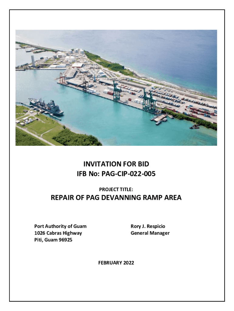 INVITATION FOR BID IF No: PAGCIP022005 PROJECT TITLE:REPAIR OF PAG DEMANDING RAMP AREA Port Authority of Guam 1026 Cabral Highway Pit, Guam 96925Rory J. Respect General ManagerFEBRUARY 2022ADBLOCK