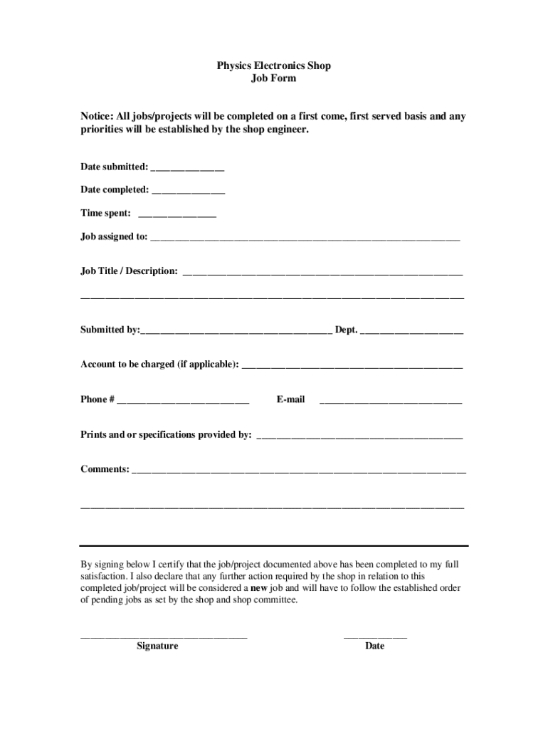 Physics Electronics Shop Job Formative: All jobs/projects will be completed on a first come, first served basis and any priorities will be established by the shop engineer. Date submitted: ___ Date