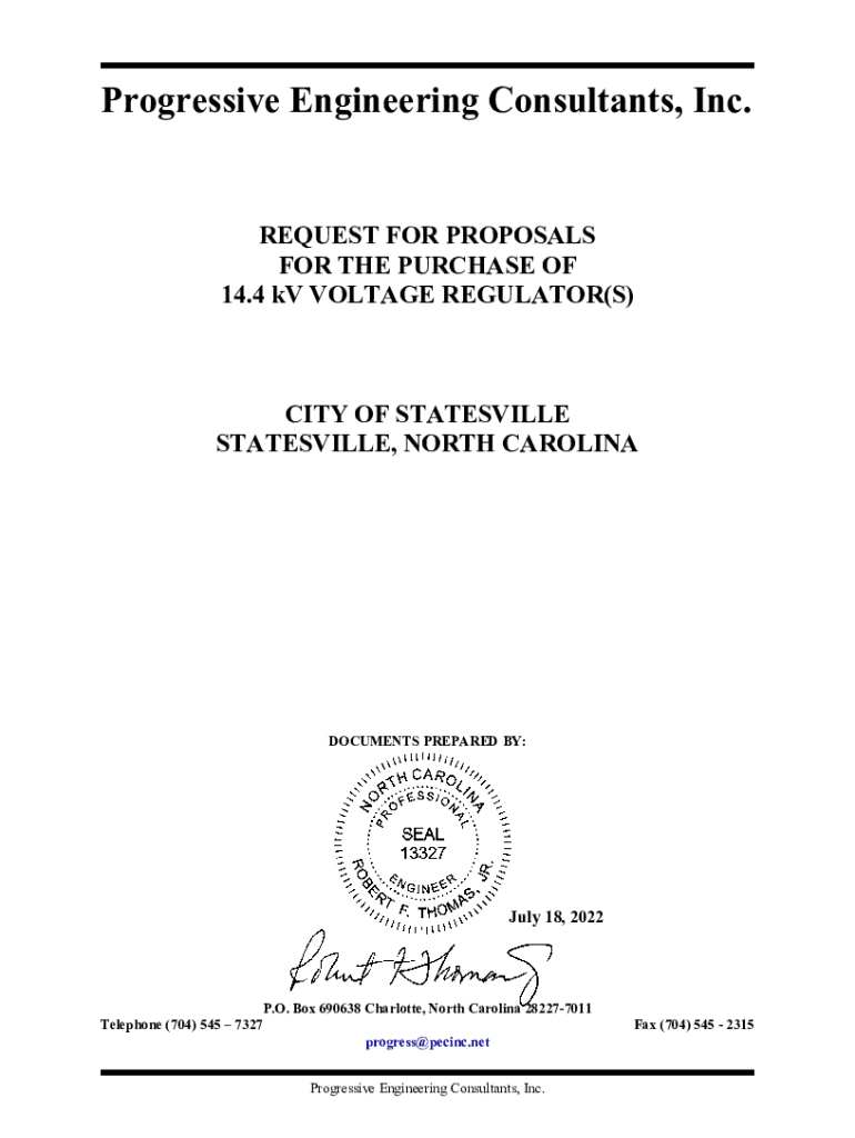 Progressive Engineering Consultants, Inc. REQUEST FOR PROPOSALS FOR THE PURCHASE OF 14.4 KV VOLTAGE REGULATOR(S)CITY OF BATESVILLE, NORTH CAROLINADOCUMENTS PREPARED BY:July 18, 2022P. O. Box 690638