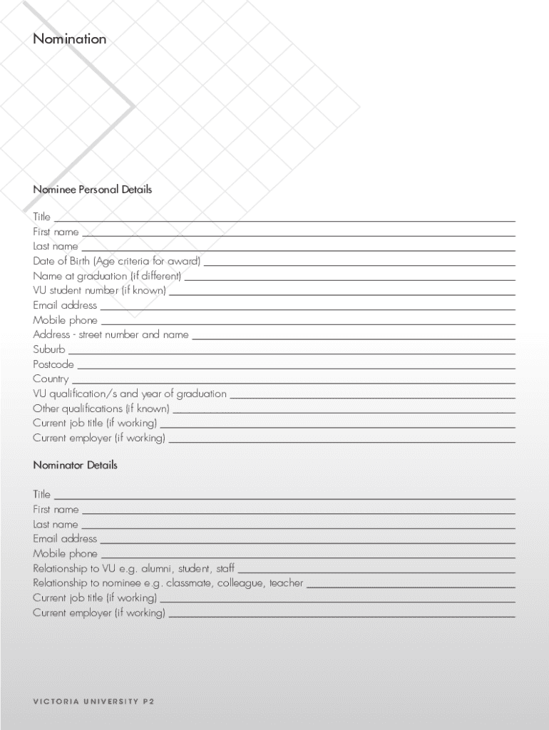 VI CTO R IA U N OVER S IT Y A LU M N I AWA R D S 2 018 PROFESSIONAL ACHIEVEMENT A LU M N I AWA R D N O M IN ATI O N FO RM PROFESSIONAL ACHIEVEMENT A LU M N I AWA R D Eligibility Criteria This Award