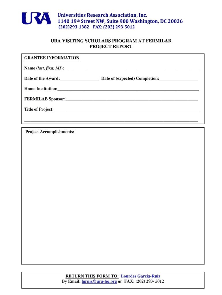 Universities Research Association, Inc. 1140 19th Street NW, Suite 900 Washington, DC 20036 (202)2931382 FAX: (202) 2935012 URA VISITING SCHOLARS PROGRAM AT TERMINAL PROJECT REPORT GRANTEE INFORMATION