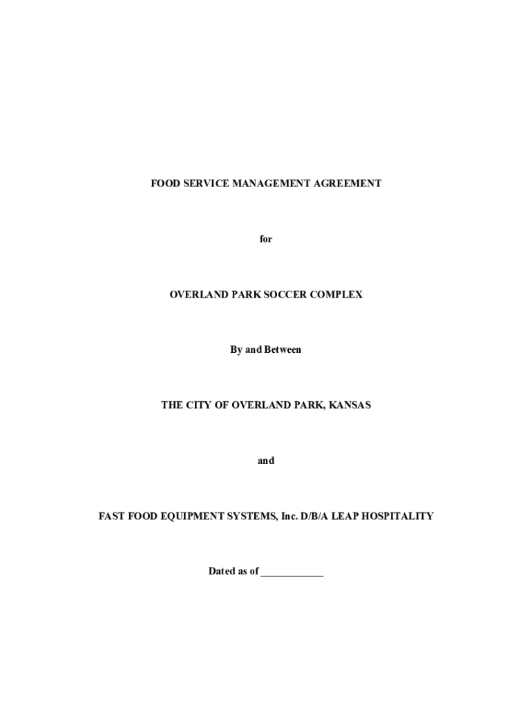 FOOD SERVICE MANAGEMENT AGREEMENTforOVERLAND PARK SOCCER Complexly and Between CITY OF OVERLAND PARK, KANSASandFAST FOOD EQUIPMENT SYSTEMS, Inc. D/B/A LEAP HOSPITALITYDated as of ___TABLE OF CONTENTS