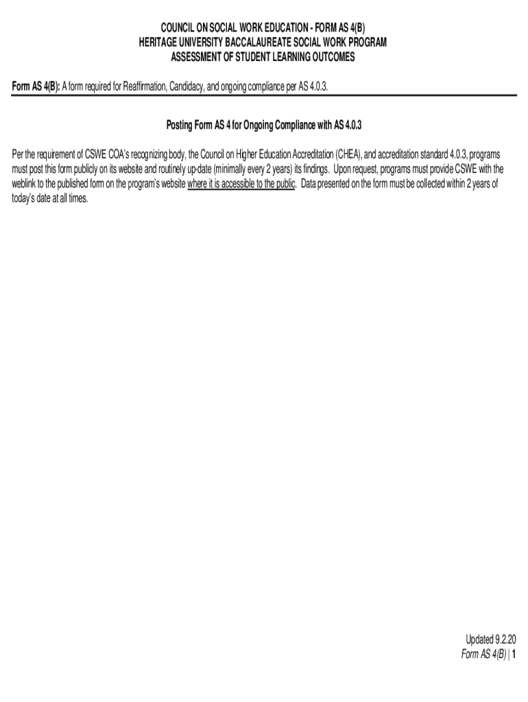 COUNCIL ON SOCIAL WORK EDUCATION FORM AS 4(B) HERITAGE UNIVERSITY BACCALAUREATE SOCIAL WORK PROGRAM ASSESSMENT OF STUDENT LEARNING OUTCOMES Form AS 4(B): A form required for Reaffirmation, Candidacy,