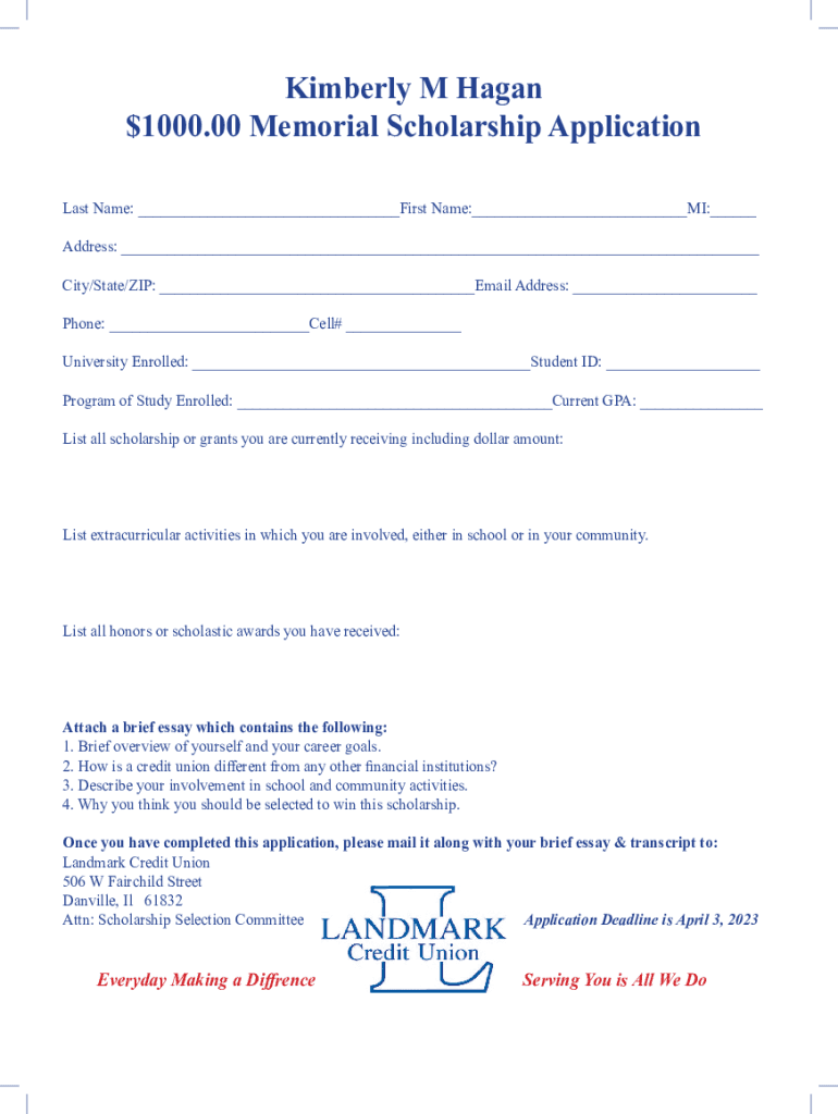 Get the free Kimberly M Hagan $1000.00 Memorial Scholarship Application