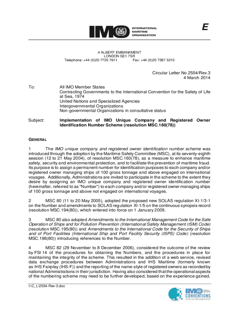 E 4 ALBERT EMBANKMENT LONDON SE1 7SR Telephone: +44 (0)20 7735 7611 Fax: +44 (0)20 7587 3210Circular Letter No.2554/Rev.3 4 March 2014 To:All IMO Member States Contracting Governments to the International