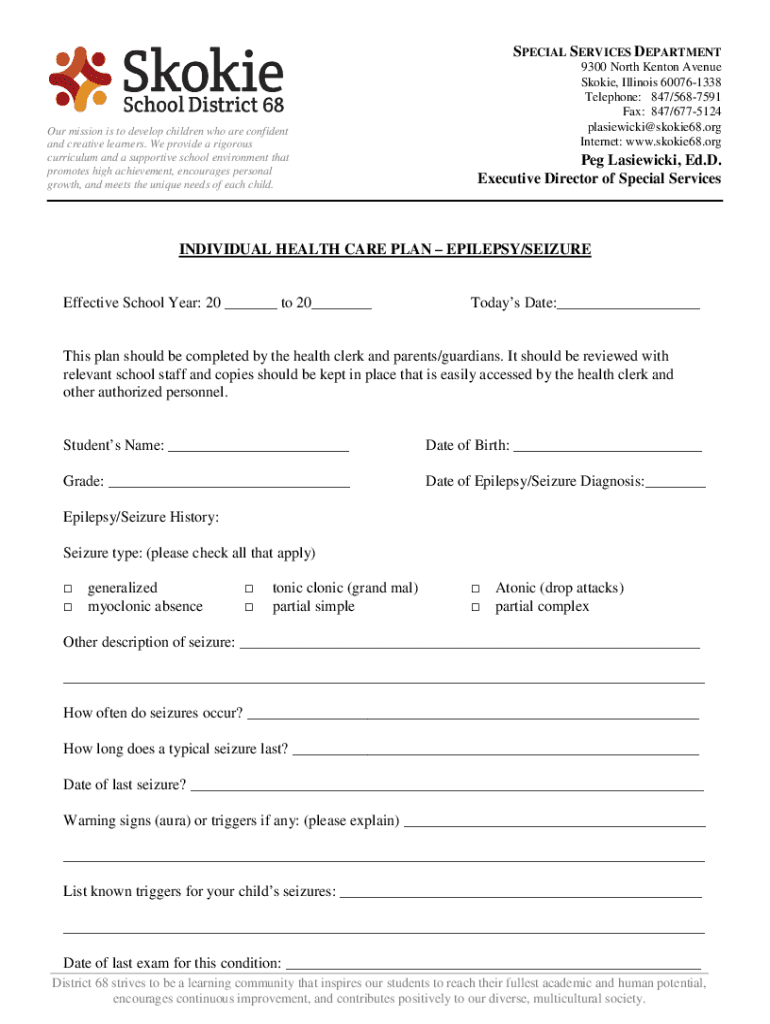 Make sure to document any specific instructions for managing a seizure, such as when to administer medication or when to seek emergency medical help.