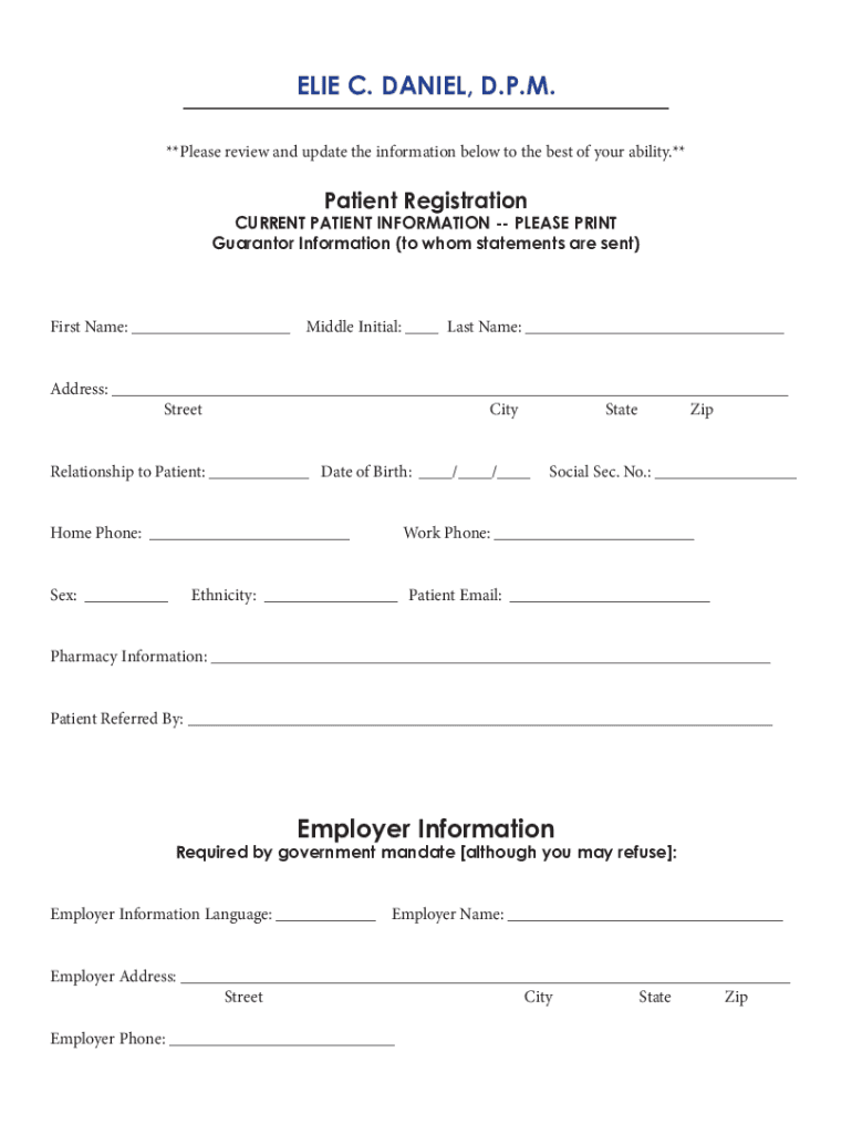 ELIE C. DANIEL, D.P.M. **Please review and update the information below to the best of your ability.**Patient RegistrationCURRENT PATIENT INFORMATION PLEASE PRINT Guarantor Information (to whom statements
