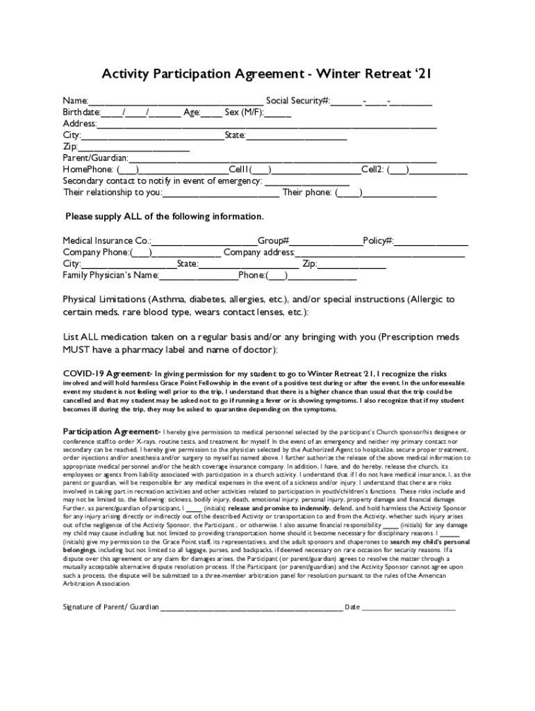 Activity Participation Agreement Winter Retreat 21 Name:___ Social Security#:_________ Birthdate:___/___/___ Age:___ Sex (M/F):___ Address:___ City:___State:___ Zip:___ Parent/Guardian:___ Homophone: