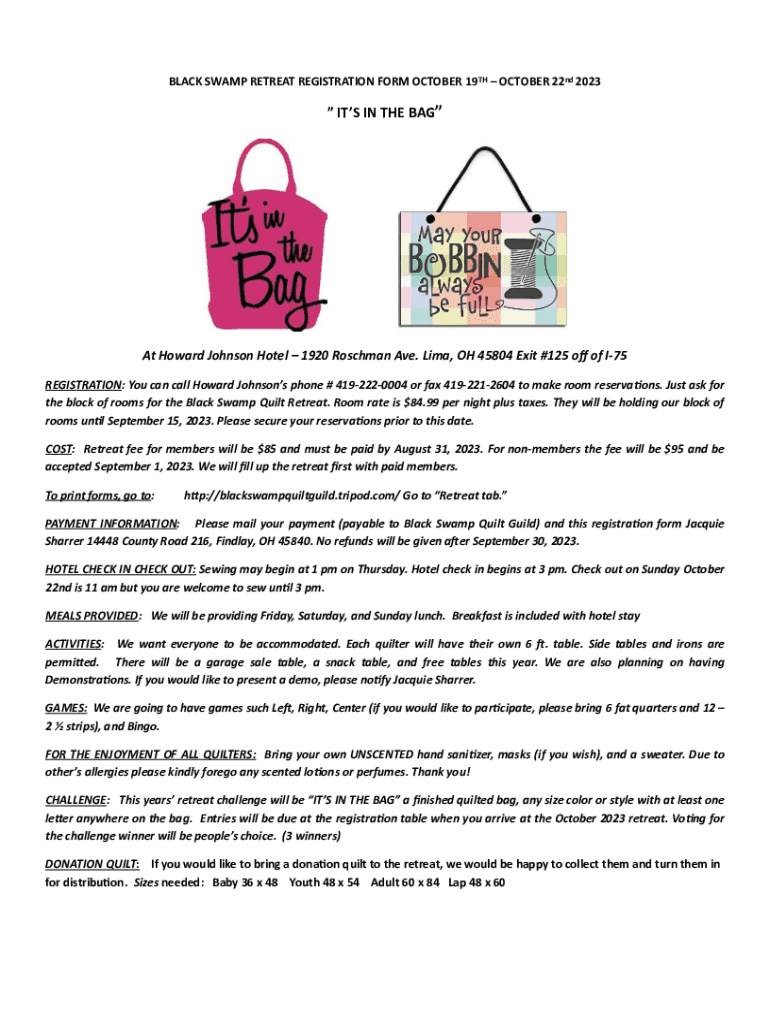 BLACK SWAMP RETREAT REGISTRATION FORM OCTOBER 19TH OCTOBER 22nd 2023 It's IN THE Begat Howard Johnson Hotel 1920 Coachman Ave. Lima, OH 45804 Exit #125 o of I75 REGISTRATION: You can call Howard Johnson's