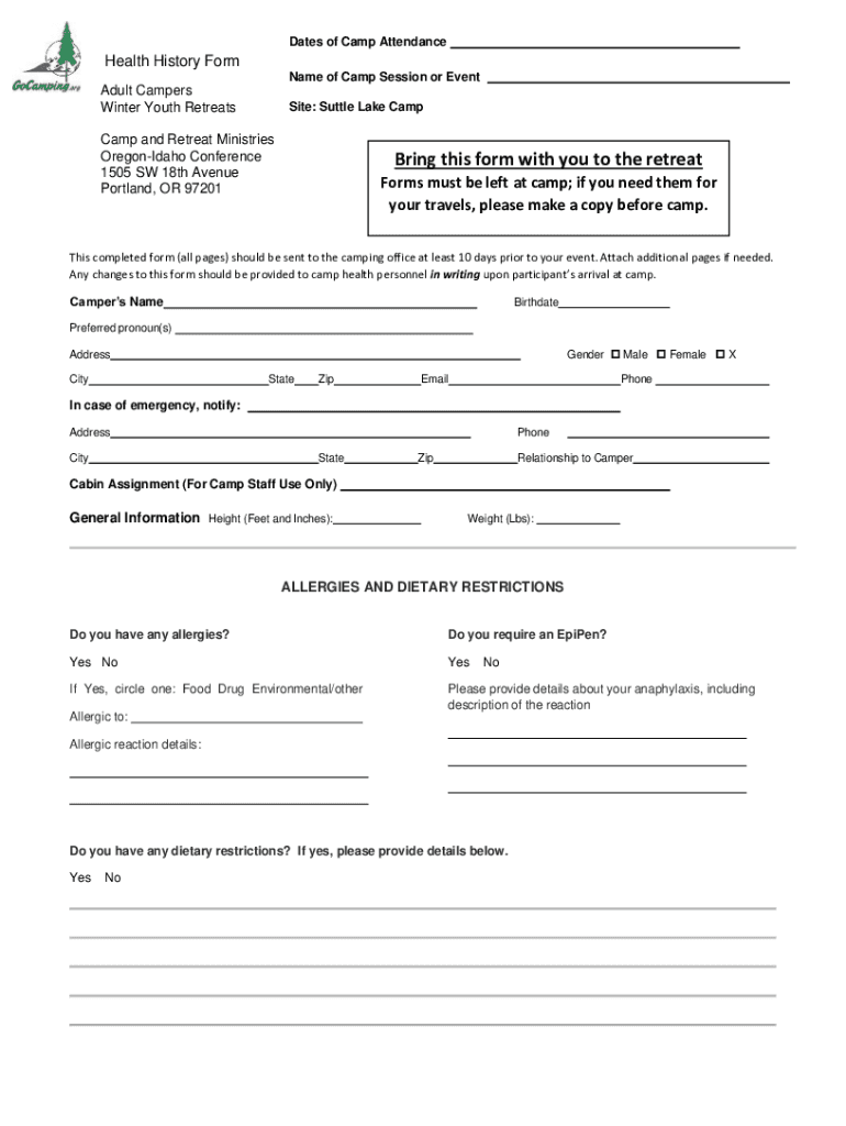 Get the free Bring this form with you to the retreat - Suttle Lake