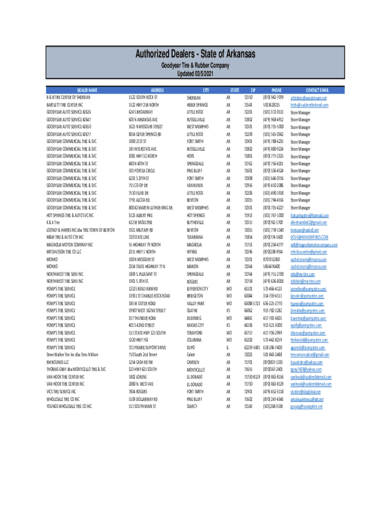 Authorized Dealers State of Arkansas Goodyear Tire & Rubber Company Updated 03/5/2021 DEALER NAME B & B TIRE CENTER OF SHERIDAN BARTLETT TIRE CENTER INC GOODYEAR AUTO SERVICE #2626 GOODYEAR AUTO SERVICE
