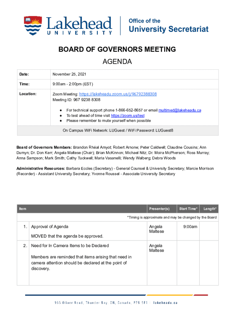 BOARD OF GOVERNORS MEETING AGENDA Date:November 25, 2021Time:9:00am 2:00pm (EST)Location:Zoom Meeting: https://lakeheadu.zoom.us/j/96792388308 Meeting ID: 967 9238 8308 For technical support phone