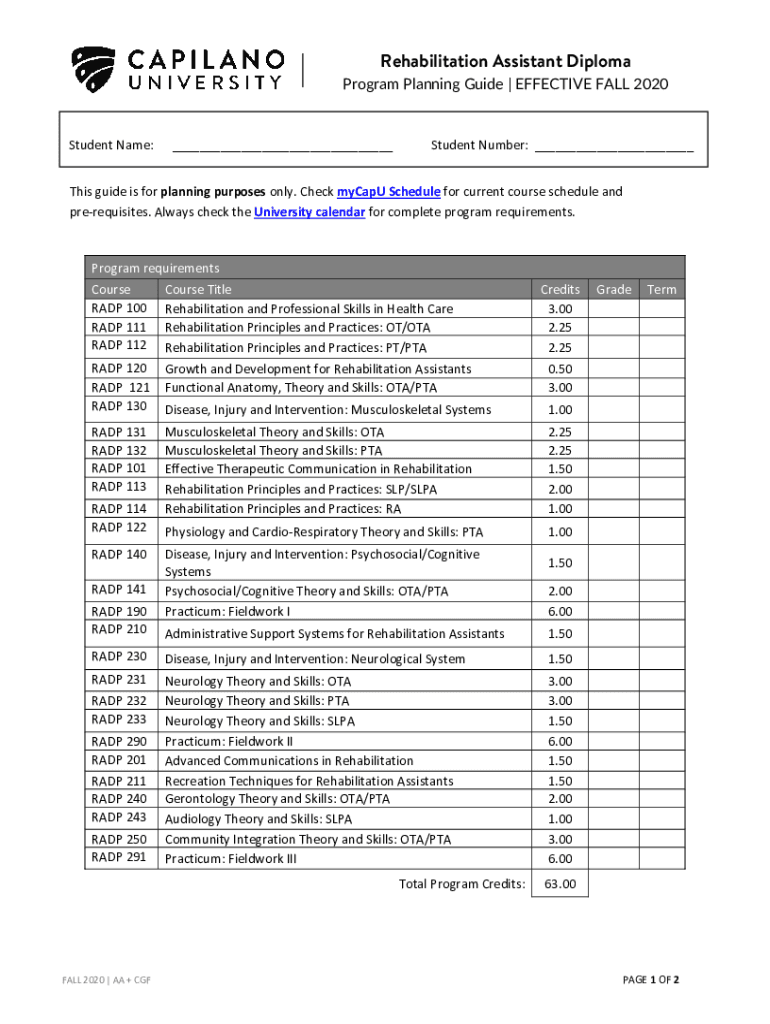Rehabilitation Assistant Diploma Program Planning Guide | EFFECTIVE FALL 2020Student Name:___Student Number: ___This guide is for planning purposes only. Check Macapá Schedule for current course