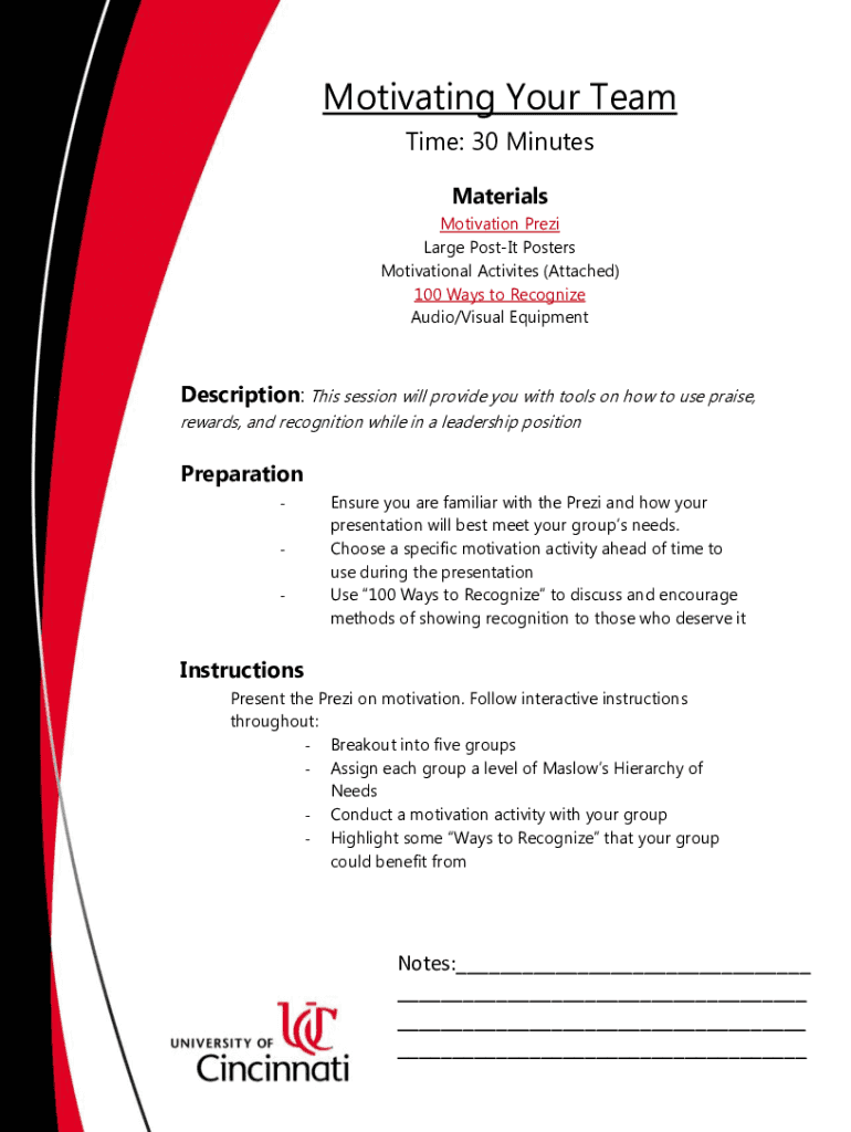 Motivating Your Team Time: 30 Minutes Materials Motivation Prezi Large Posit Posters Motivational Activities (Attached) 100 Ways to Recognize Audio/Visual EquipmentDescription: This session will provide