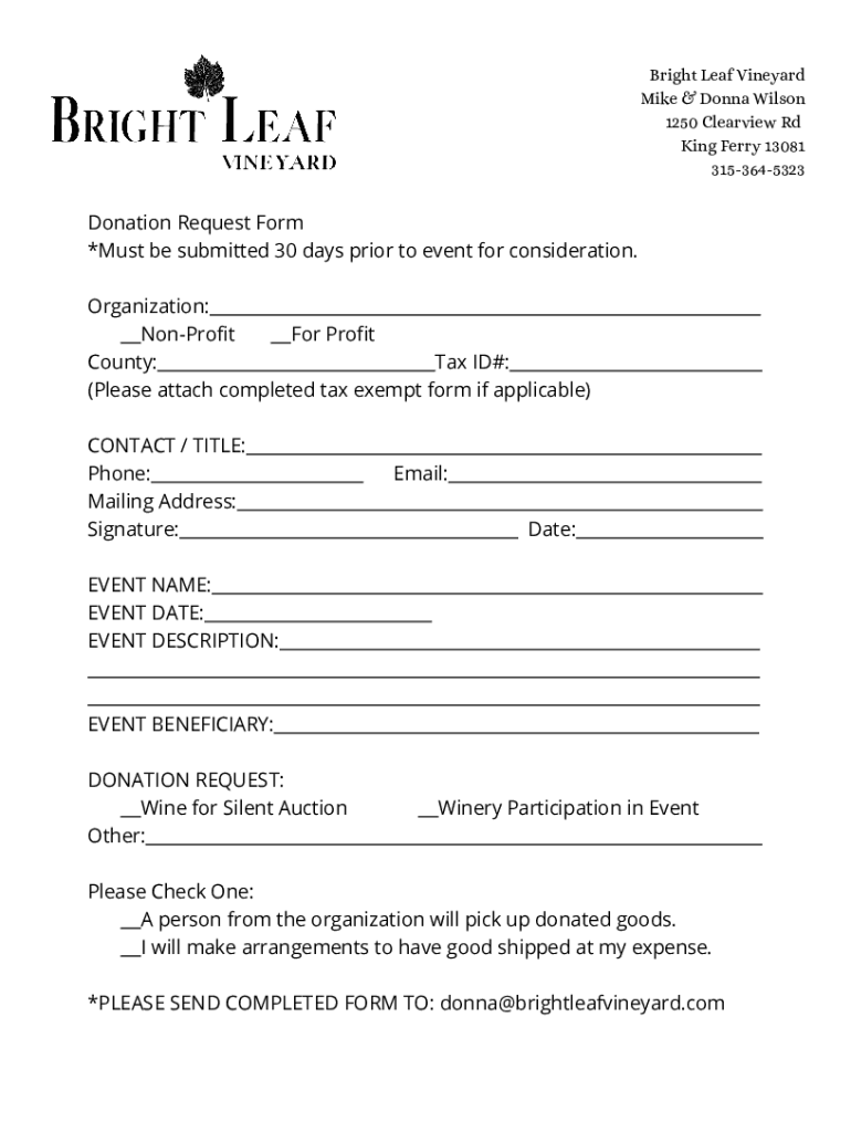 Bright Leaf Vineyard Mike & Donna Wilson 1250 Clearview Rd King Ferry 13081 3153645323Donation Request Form *Must be submitted 30 days prior to event for consideration. Organization: Nonprofit For