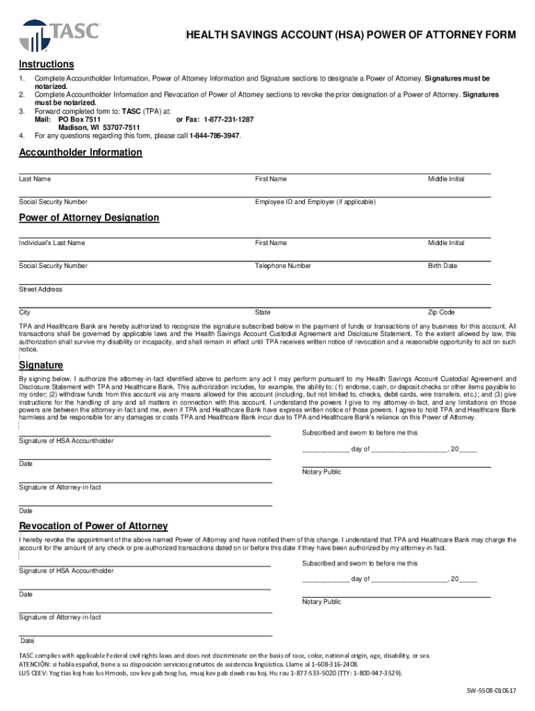HEALTH SAVINGS ACCOUNT (HSA) POWER OF ATTORNEY FORM Instructions 1. 2. 3.4. Complete Account holder Information, Power of Attorney Information and Signature sections to designate a Power of Attorney.