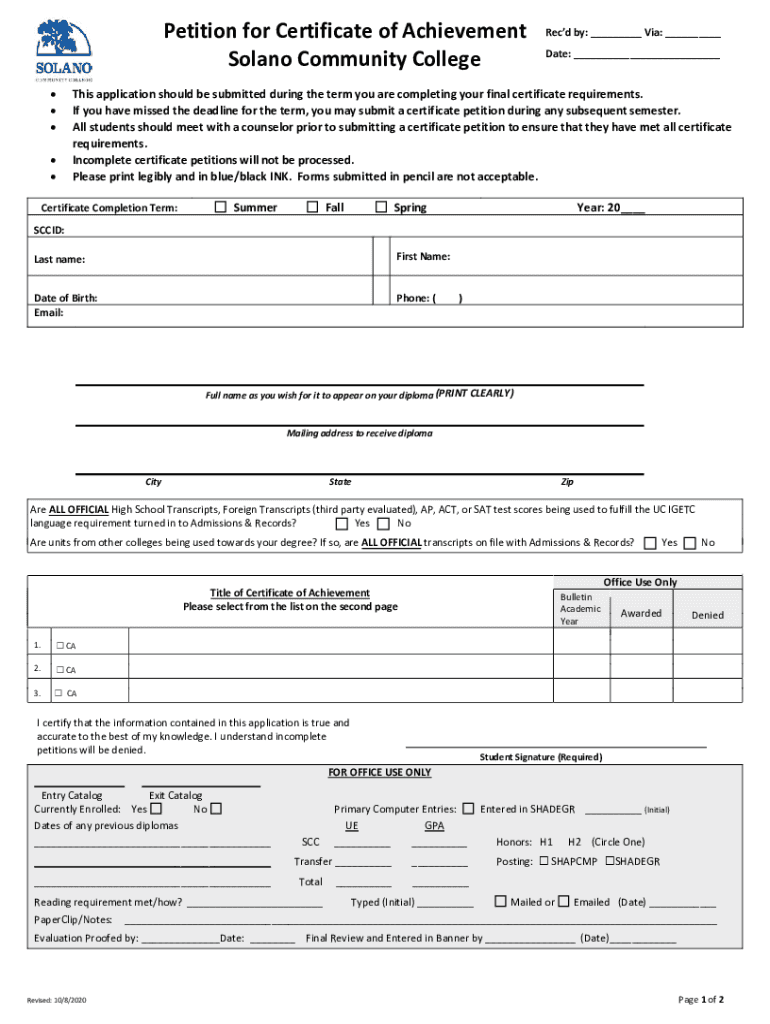 Petition for Certificate of Achievement Solano Community College Recd by: ___ Via: ___ Date: ___This application should be submitted during the term you are completing your final certificate requirements.