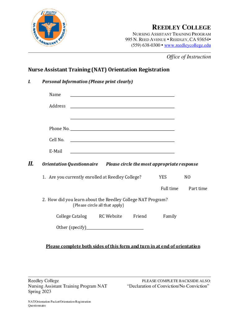 MEDLEY COLLEGE NURSING ASSISTANT TRAINING PROGRAM 995 N. REED AVENUE MEDLEY, CA 93654 (559) 6380300 www.reedleycollege.edu ___Office of Instruction Nurse Assistant Training (NAT) Orientation Registration
