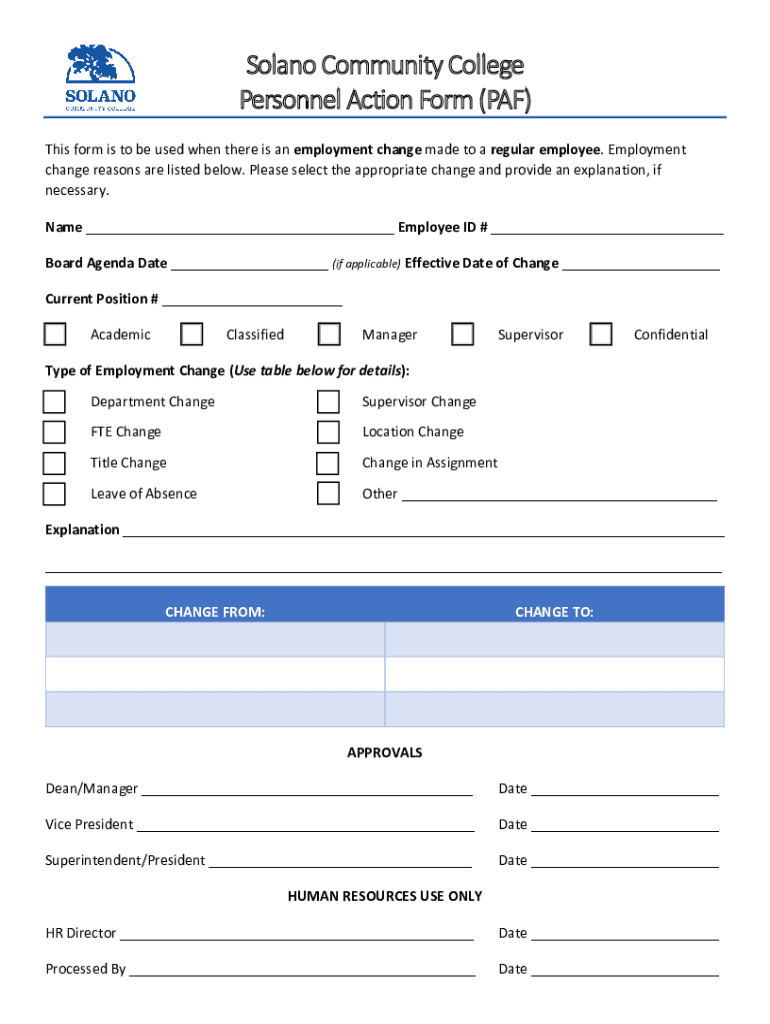 Solano Community College Personnel Action Form (PAF) This form is to be used when there is an employment change made to a regular employee. Employment change reasons are listed below. Please select