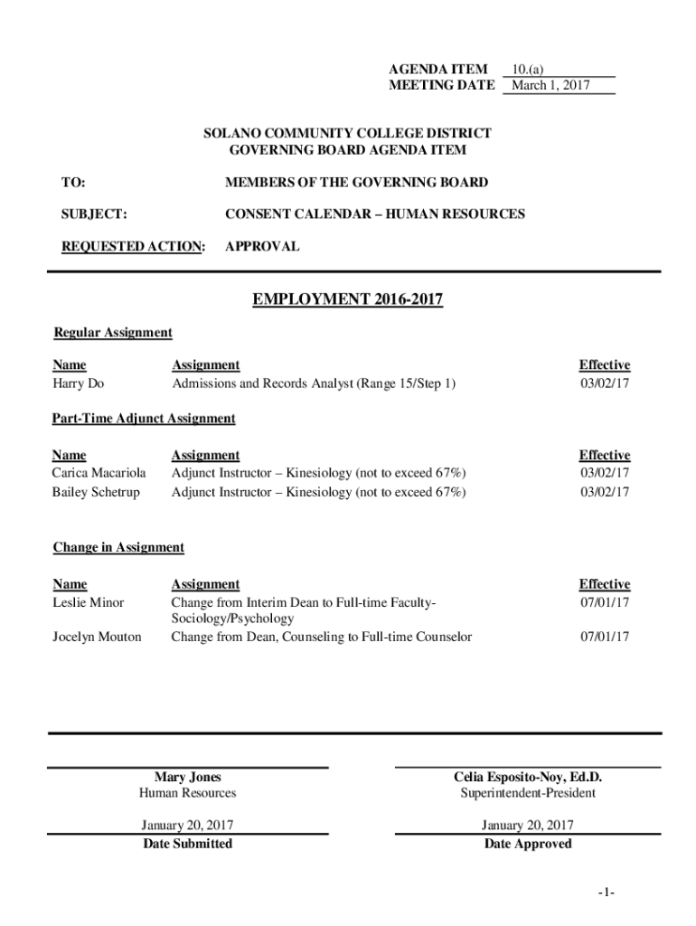 AGENDA ITEM MEETING DATE10.(a) March 1, 2017SOLANO COMMUNITY COLLEGE DISTRICT GOVERNING BOARD AGENDA ITEM TO:MEMBERS OF THE GOVERNING BOARDSUBJECT:CONSENT CALENDAR HUMAN RESOURCESREQUESTED ACTION:APPROVALEMPLOYMENT