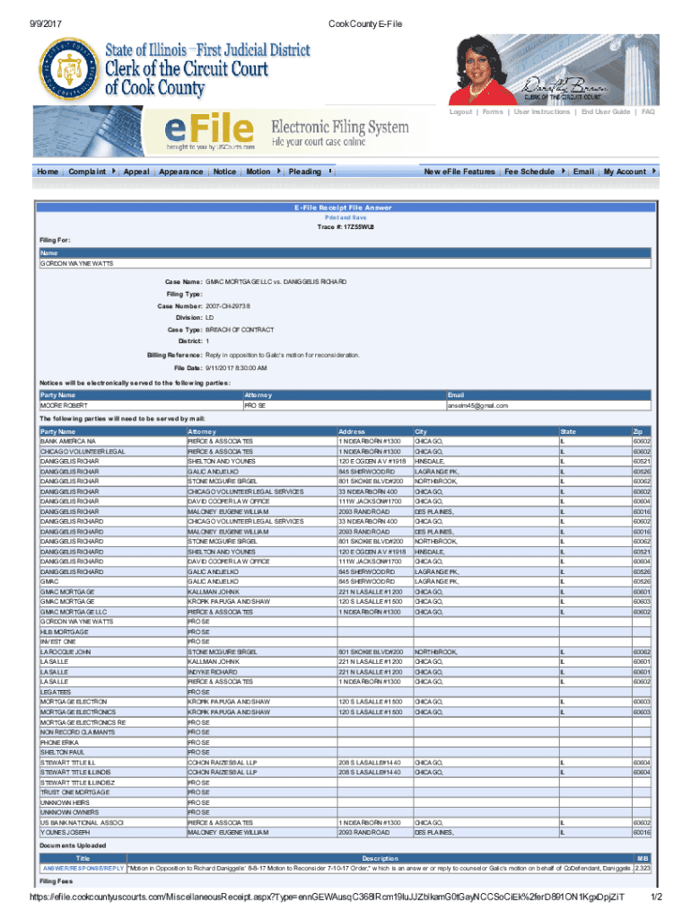 9/9/2017Cook County EFileLogout | Forms | User Instructions | End User Guide | FAQHomeComplaintAppealAppearanceNoticeMotionPleadingNew file Features ScheduleEmailMy Accountable Receipt File Answer