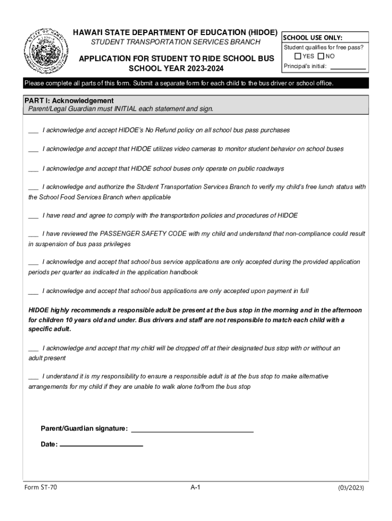 SCHOOL BUS HANDBOOK APPLICATION FORM School Year 20232024Office of Facilities and Operations Student Transportation Services Branch Hawaii State Department of Education RS 230945 (Rev. of 220974)