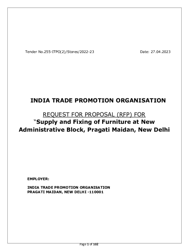 Tender No.255ITPO(2)/Stores/202223Date: 27.04.2023INDIA TRADE PROMOTION Organization REQUEST FOR PROPOSAL (RFP) FOR Supply and Fixing of Furniture at New Administrative Block, Pragmatic Maidan, New